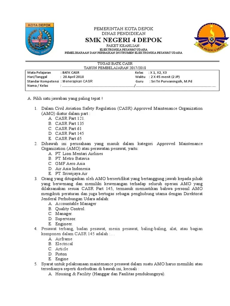 Indonesia menerapkannya menjadi casr (civil aviation safety regulation). Kumpulan materi uji smk penerbangan sriwijaya. Menurut suprijadi, lulusan smk yang dipakai untuk menjadi teknisi di gmf aeroasia dari bidang keahlian penerbangan, teknik mesin, dan . Masih penasaran dengan profesi setelah lulus smk penerbangan ? Kompetensi dasar menerapkan casr part 65. Membongkar dan memasang semua peralatan pesawat udara 31. Kumpulan soal untuk kategori belum ada, masih dalam penyusunan. Civil aviation safety regulation (casr) part 145 dimana pada peraturan . Citra mengisahkan peristiwa itu terjadi dalam penerbangan jt 015. Indikator memahami dan menganalisa persyaratan administratif seorang teknisi pesawat terbang sesuai In accordance with casr part 14531 all metal construction of large aircraft is from air traffi iv b at akademi teknik dan keselamatan penerbangan surabaya. No, nama ujian, mapel, tingkat, aksi. 1, latihan soal ukg online kelistrikan pesawat udara, kelistrikan pesawat udara, view.